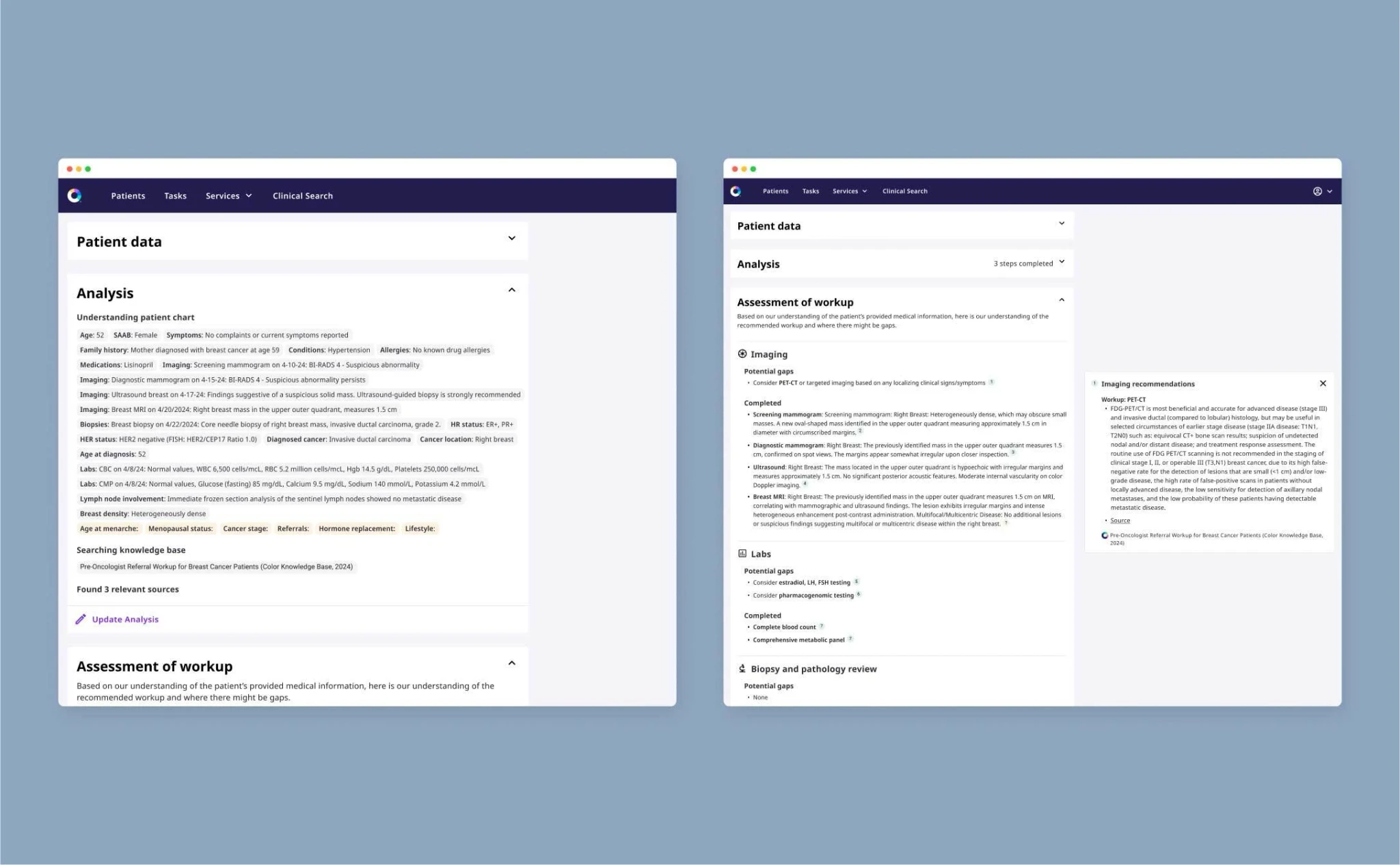 To ensure Cancer Copilot delivered clinically accurate recommendations, I worked with the clinical team and product team on the development of a golden dataset of synthetic patient cases, a critical benchmarking tool for testing and refining AI performance. I also collaborated with team to design evaluation criteria and define our strategy and processes for model evaluation. This approach allowed us to do continuous iterations on AI outputs and validate performance.